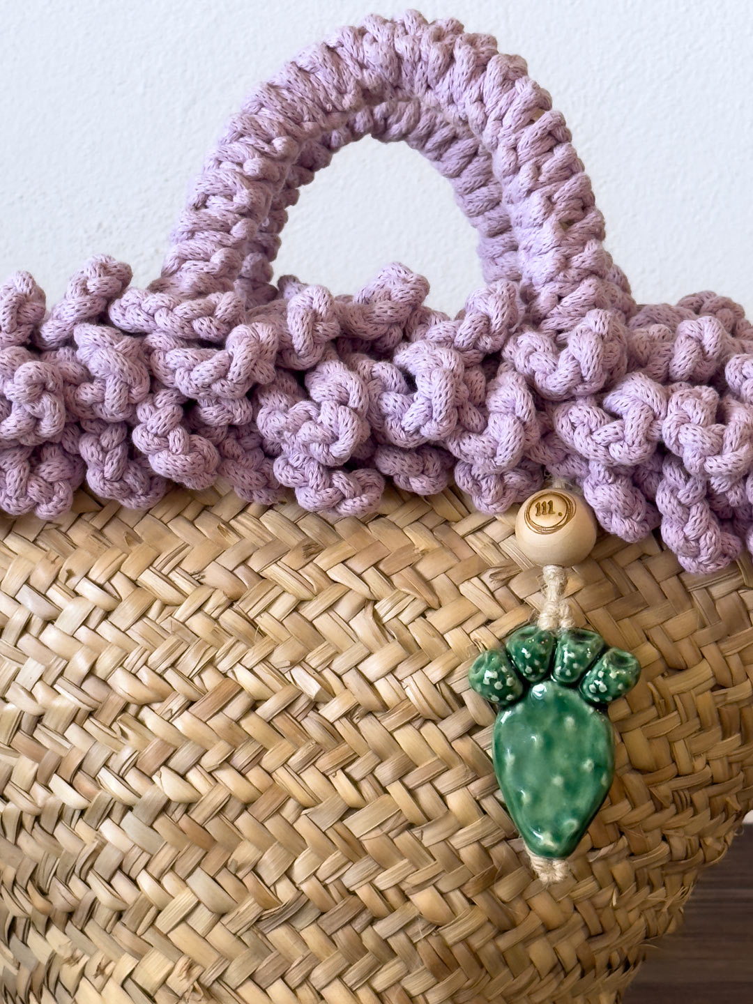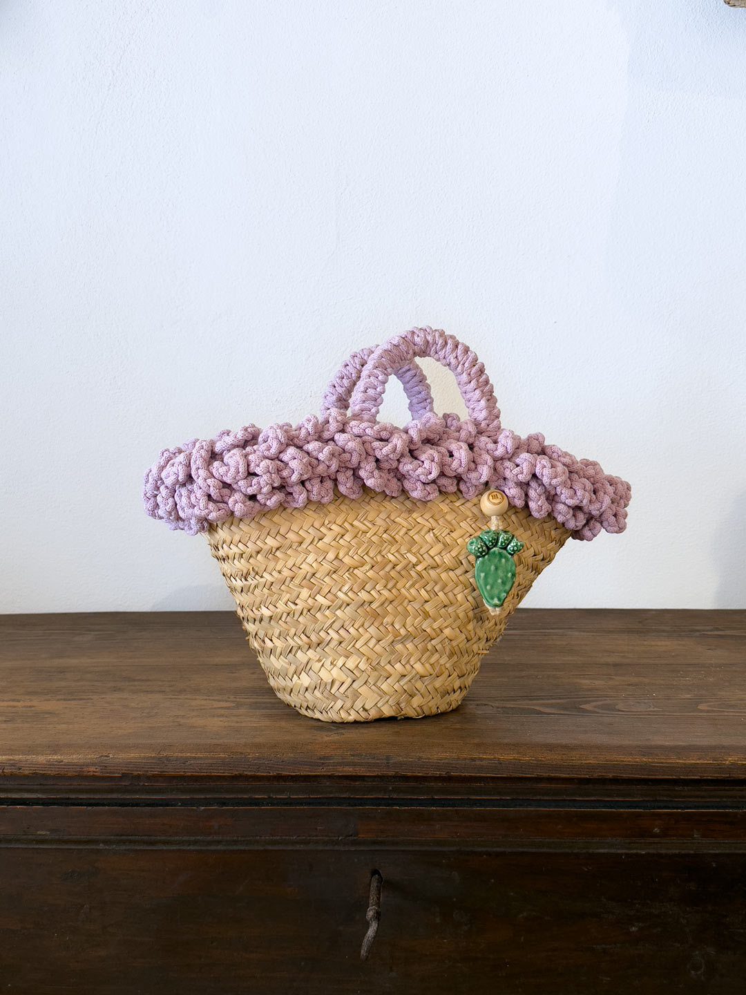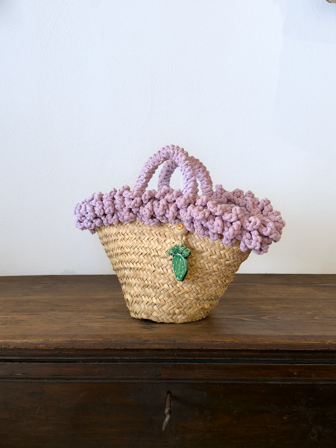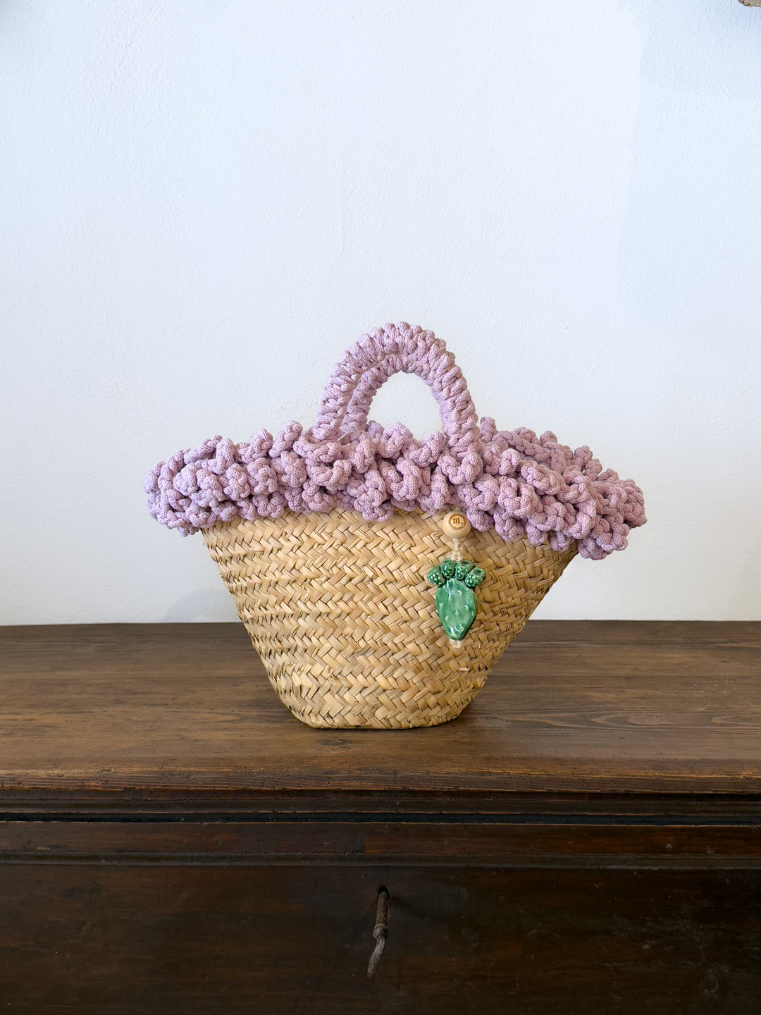 Lavorazione bordo e manico ad uncinetto in filo di cotone colore lilla