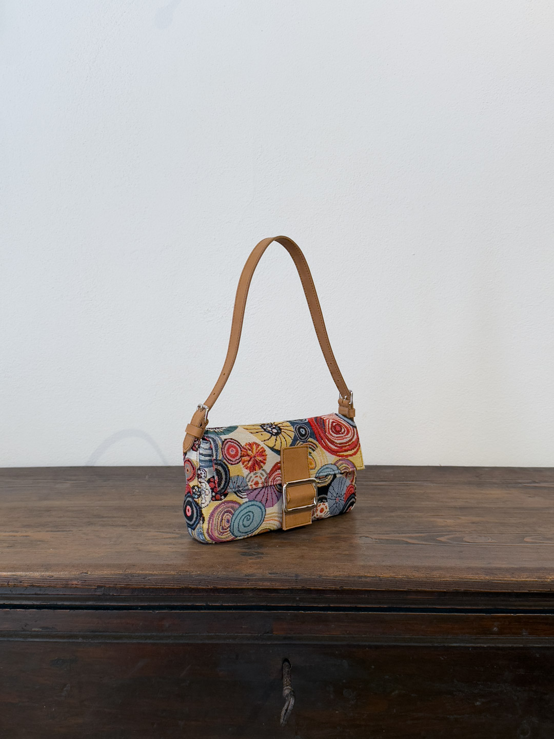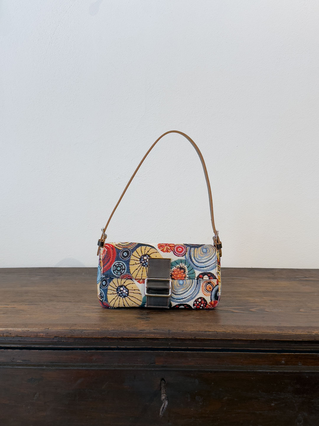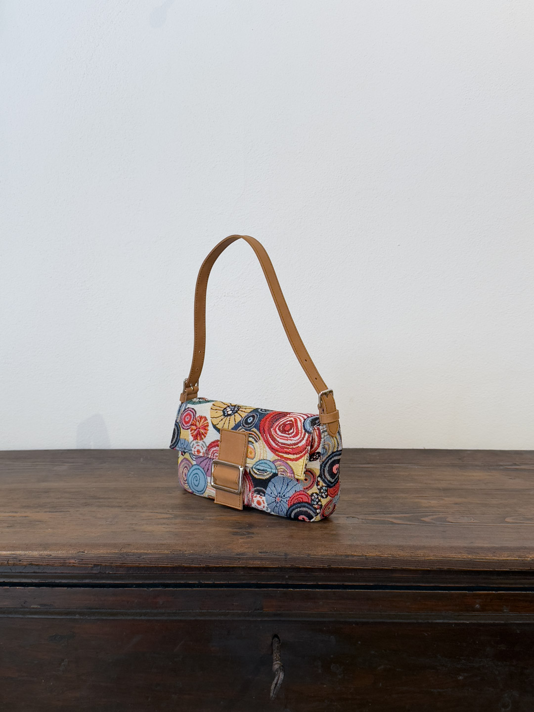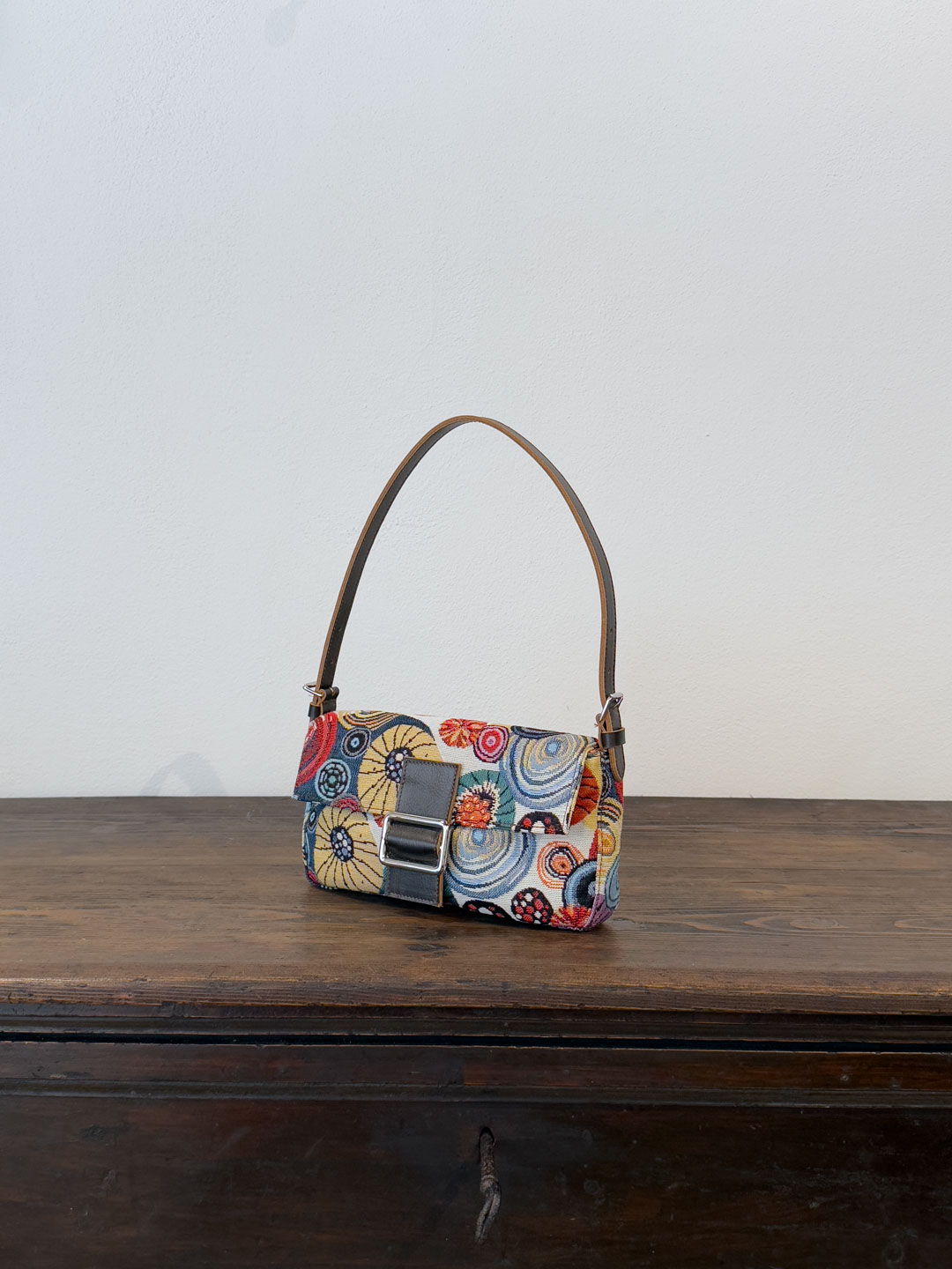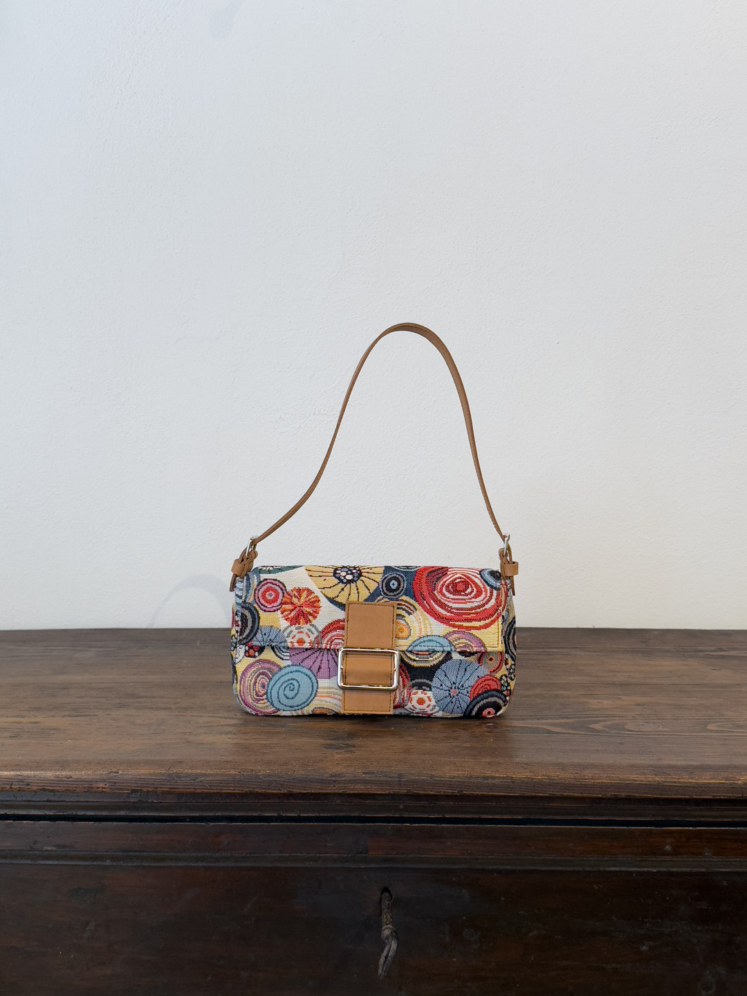 Rivestita nell’iconico gobelin “Ricci” — trama narrativa del nostro immaginario mediterraneo — è rifinita con cura artigianale, dotata di una patta frontale, chiusura con bottone magnetico e accessori metallici color argento.
