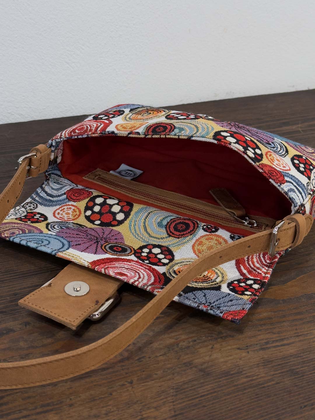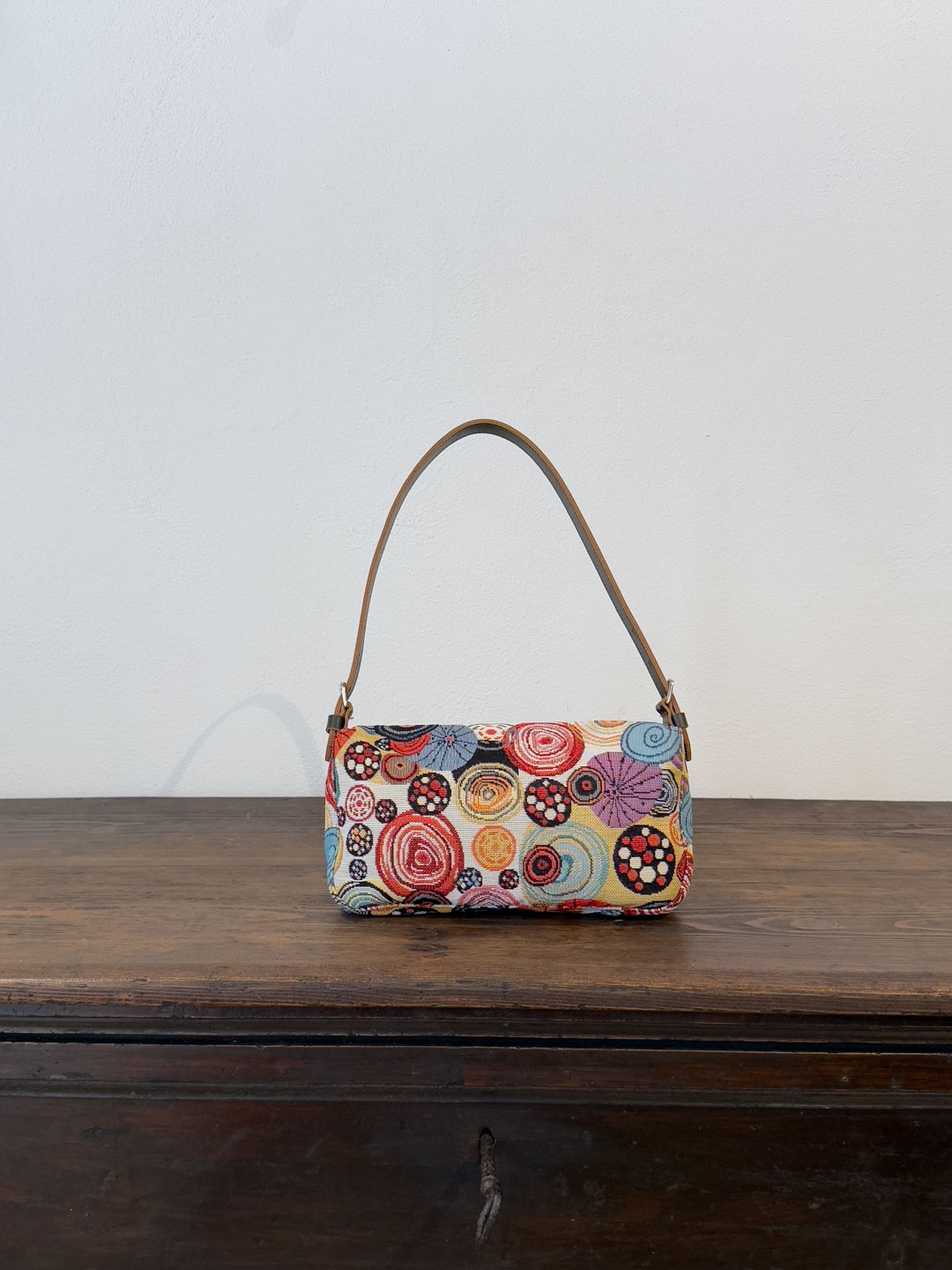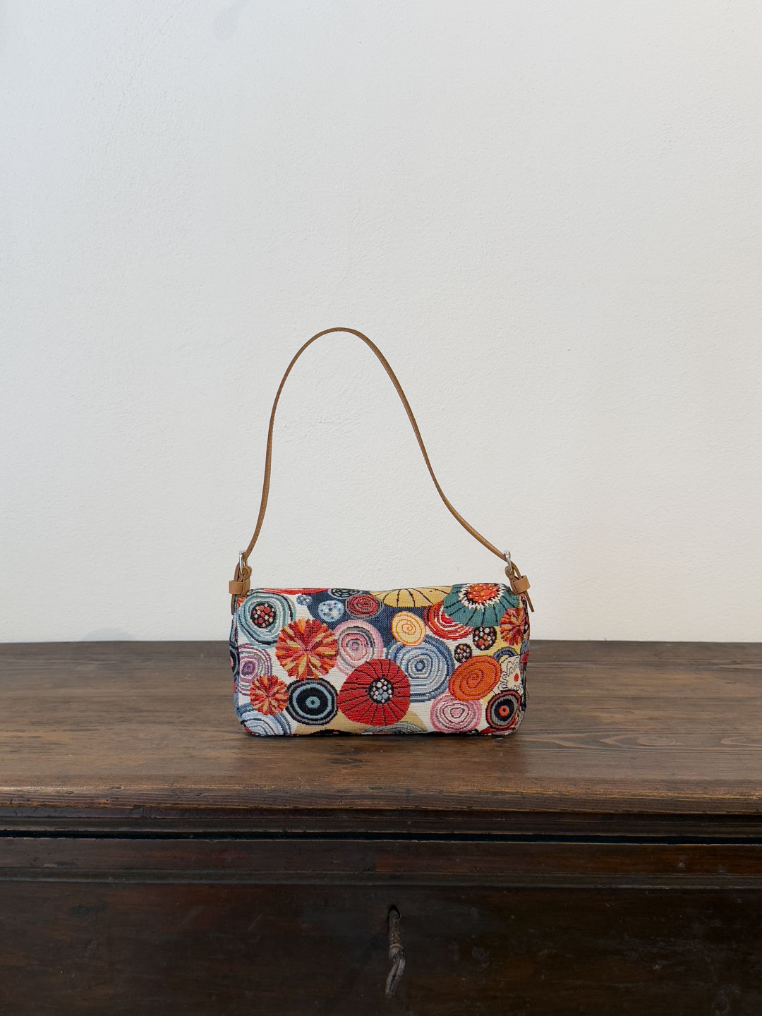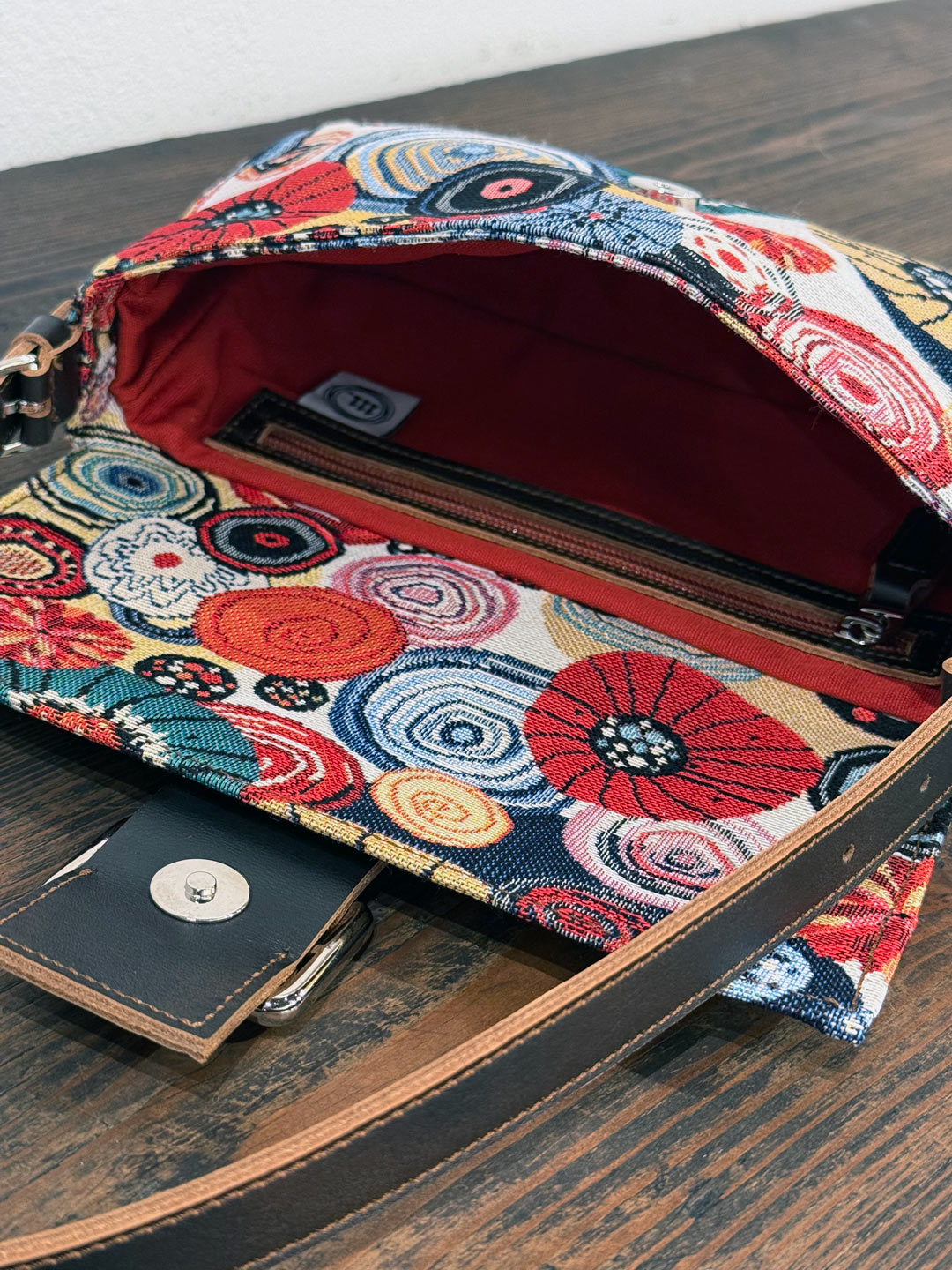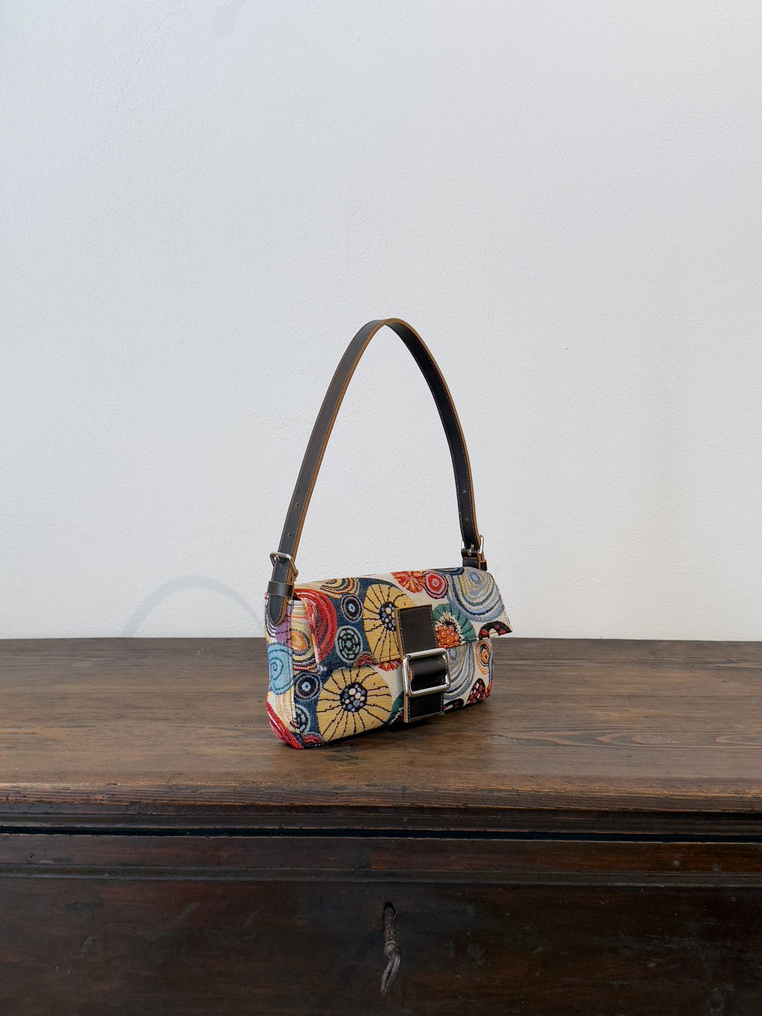 Rivestita nell’iconico gobelin “Ricci” — trama narrativa del nostro immaginario mediterraneo — è rifinita con cura artigianale, dotata di una patta frontale, chiusura con bottone magnetico e accessori metallici color argento.