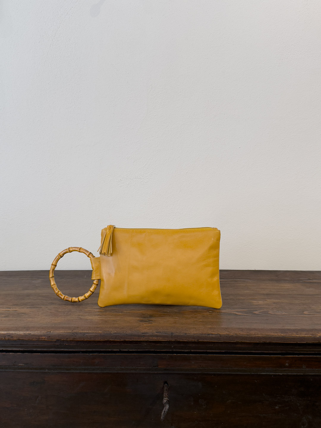 Pochette in nappa, chiusura zip con mappina in nappa e manico in bambù